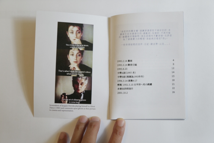 “从你的声音里,逐渐瓶凑那些不再存在的,本应发生但未曾发生的、错乱的、失落的、不再可能的。幽灵般的残余物。我在房间内不断徘徊,也许是为了通过费力的整理,我能再次看见‘你’。 一些你寄给她的信件、日记、录音带,以及…”